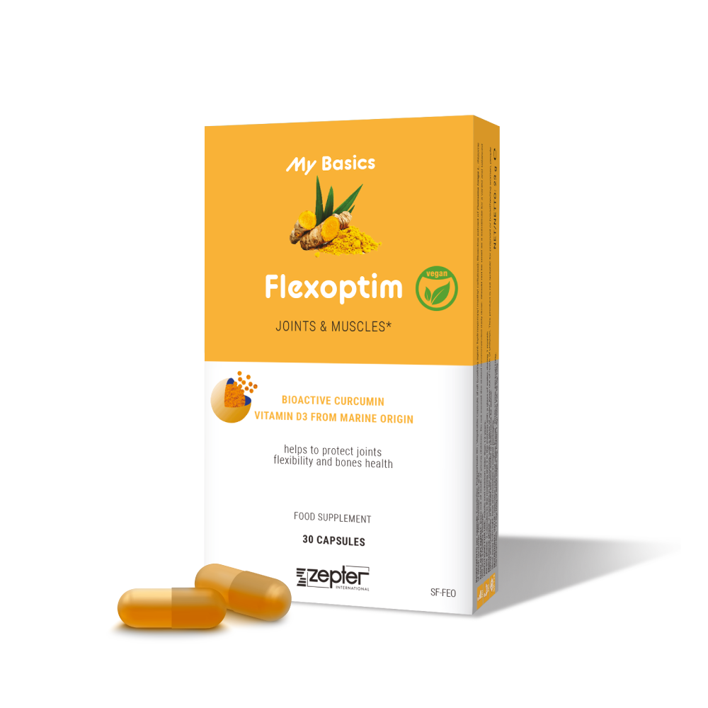 Zdrowe stawy i chrząstki pozwalają nam swobodnie poruszać się i cieszyć życiem. Urazy, starzenie się, otyłość i czynniki genetyczne mogą je osłabić, a nawet uszkodzić. Flexoptim to unikalna innowacyjna formuła zawierająca bioaktywną kurkuminę, która pomaga chronić elastyczność stawów oraz dbać o zdrowie chrząstek i kości. Kurkumina działa przeciwutleniająco i przeciwzapalne. Swoją skuteczność Flexoptim zawdzięcza rozpuszczeniu kurkuminy w bioaktywnej płynnej emulsji micelarnej. Jedna tabletka zawiera 42 mg tej substancji. Flexoptim zawiera również witaminę D3 pochodzenia morskiego (algi), która pomaga zachować właściwą strukturę kości.