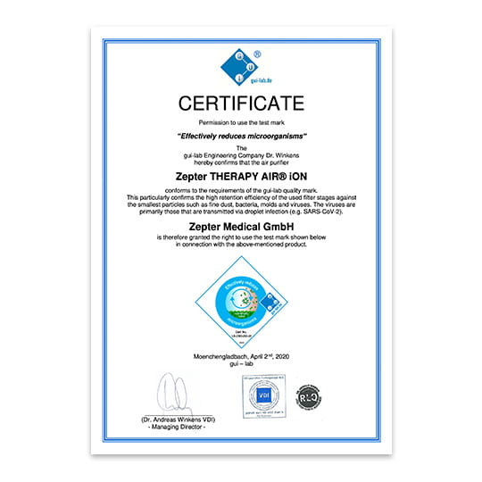 W kwietniu 2020 roku urzadzenie Therapy Air Ion otrzymało CERTYFIKAT GUI-LAB potwierdzający wysoką skuteczność w przypadku najmniejszych cząstek zanieczyszczeń i mikroorganizmów, bakterii i wirusów przenoszonych drogą kropelkową takich jak np. SARS-CoV-2. Test został przeprowadzony w Niemczech przez certyfikowane laboratorium GUI-LAB pod nadzorem Dr. Andreasa Winkensa.